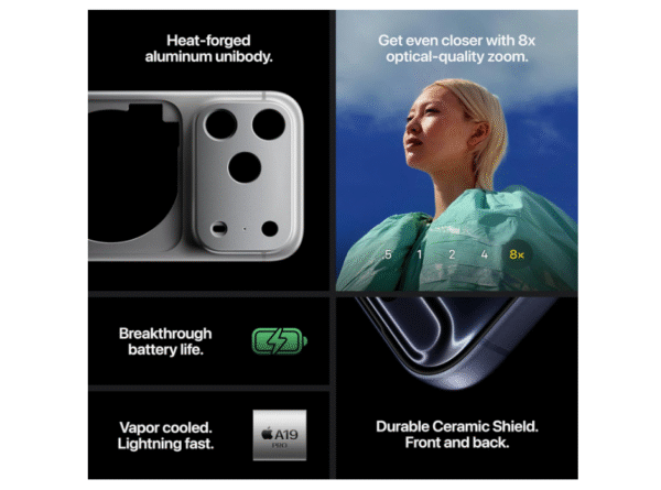 - THE ULTIMATE PRO CAMERA SYSTEM—With all 48MP rear cameras and 8x optical-quality zoom—the widest zoom range ever in an iPhone. It’s the equivalent of 8 pro lenses in your pocket.